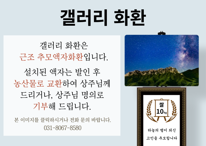갤러리화환은 근조액자를 설치하고 발인 후 쌀로 교환하여